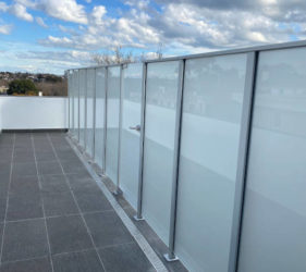 Glass is cantilevered from an aluminium base channel set in the decking. All panels are to be a minimum height of 100mm from all finished surfaces (tiles, pavers, decking, and planter boxes .etc). Glass widths vary from 1200mm-2200mm with 20-50mm gaps between panels.